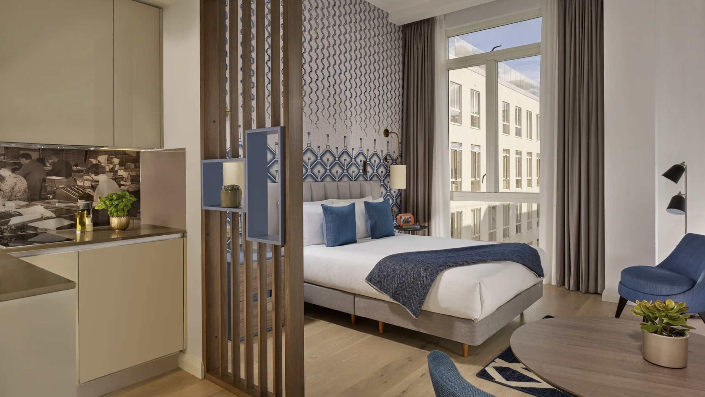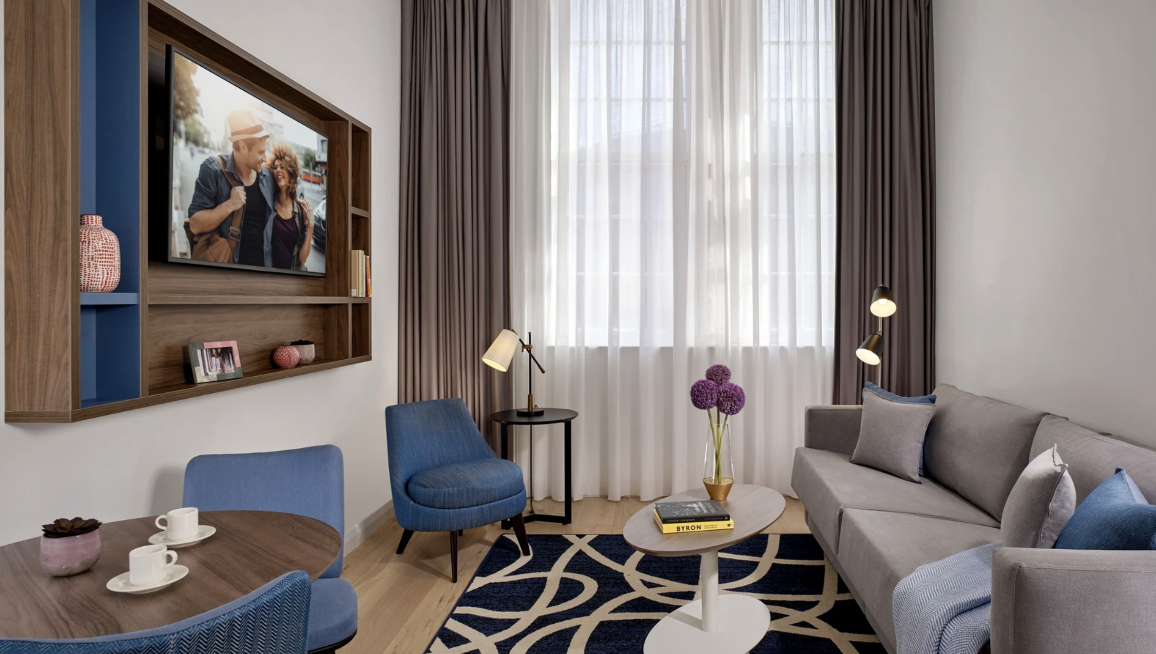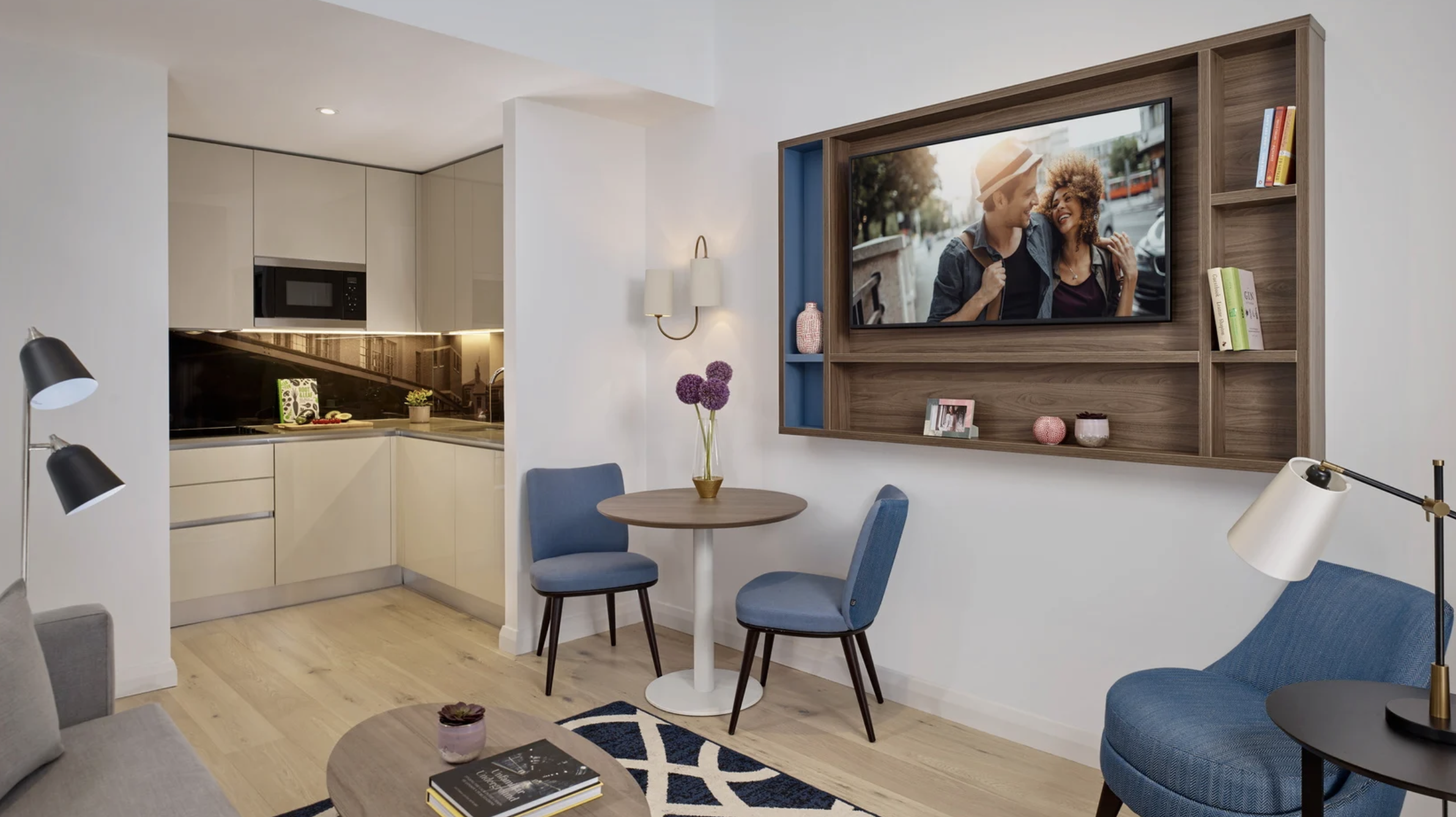Each apartment is thoughtfully designed with contemporary décor and functional living space. Fully equipped kitchens include a dishwasher and modern appliances, offering flexibility for longer stays. Selected apartments feature a washer/dryer, while additional laundry facilities are available within the building. Comfortable sleeping areas, smart TVs, and dedicated workspaces ensure guests enjoy both convenience and relaxation in a stylish setting.